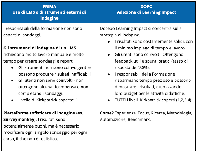 I risultati anonimi dei sondaggi vengono poi trasformati in report di facile lettura, accessibili direttamente nella piattaforma eLearning Docebo, consentendo ai responsabili della formazione di ottimizzare il design, i contenuti e le modalità di erogazione dei corsi formali, il tutto con un approccio meno soggettivo.