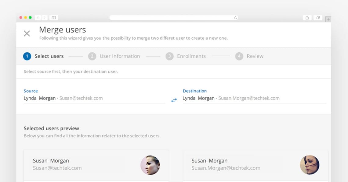 - Combinación de perfiles de usuarios - puede combinar dos perfiles de usuarios, incluyendo datos de inscripción, para eliminar la información duplicada.