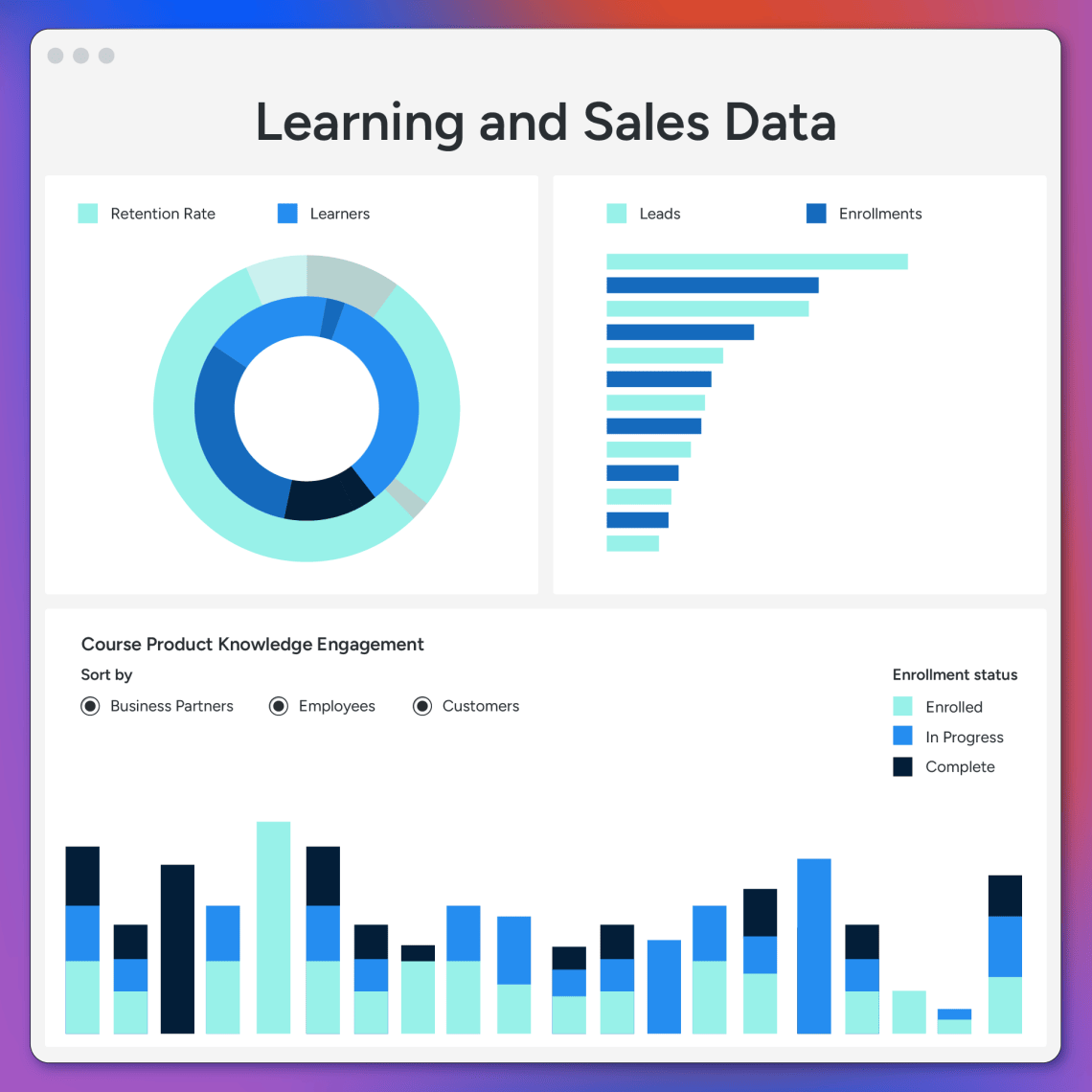 Finally, Learn Data lets you export clean, organized, and high quality learning data and bring it directly into your own Business Intelligence tool. This empowers sophisticated organizations to see connections and correlations between metrics collected from different parts of the business, like learning and sales.