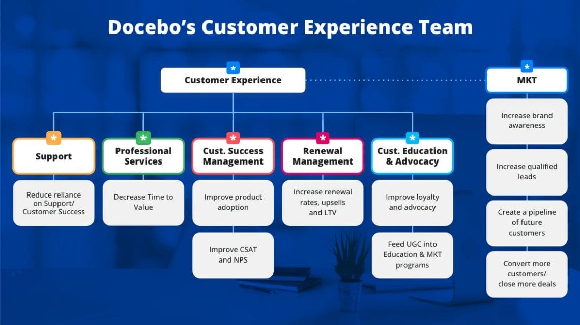 Cross-functional teams bring people from different areas together under a common mandate. For example, at Docebo, our Customer Experience team consists of groups including: Support, Professional Services, Customer Success, Renewal Management, and Customer Education. The Customer Experience team works very closely with Marketing as well.