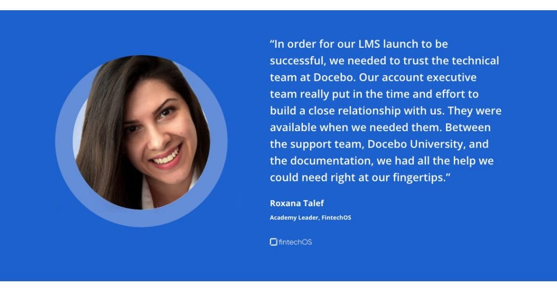 This may feel like a lot to consider, but you can achieve amazing results relatively quickly. For example, FintechOS is a technology company that helps banks, financial institutions and insurers launch new products. But when they wanted to launch a new learning academy for their employees and partners, they chose Docebo. With Docebo’s help, they went from procurement to launch in just nine weeks. And that academy has had an incredible impact, with 5-7 full courses completed per user.