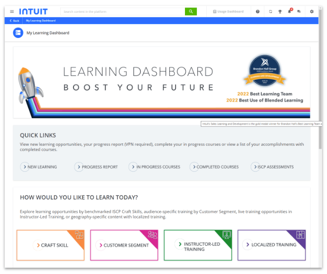 Even the learners’ dashboards were personalized (based on the choices they’d made), so they would see only what’s relevant to them. As Angie Kleinsorge, Intuit’s Manager of L&D, says, “Our learners’ time is valuable, and they don’t want to waste time trying to find training. They just want to get in and get out.”
