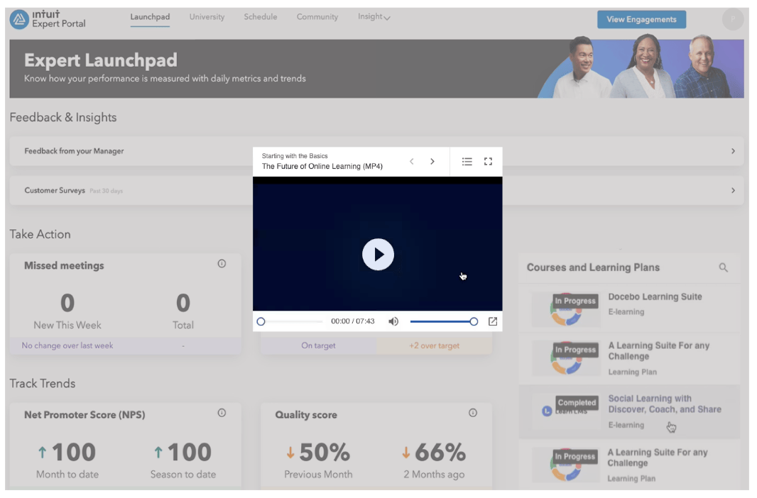 With Docebo’s help, Intuit was able to seamlessly integrate training into their CRM. Personalized learning plans and courses now appear on the home page of the CRM. When an employee clicks on the learning content, it launches directly within the tool.